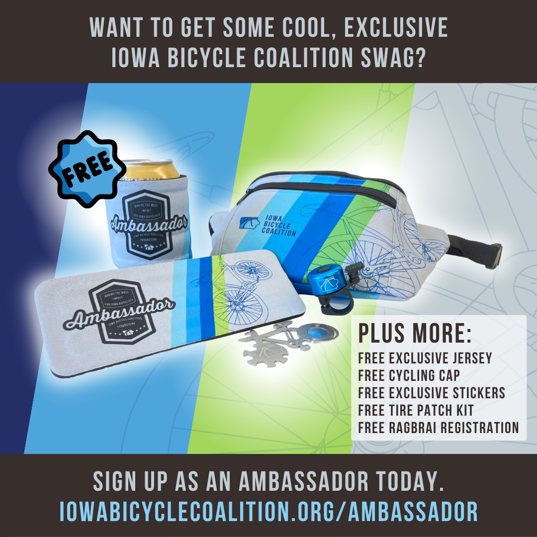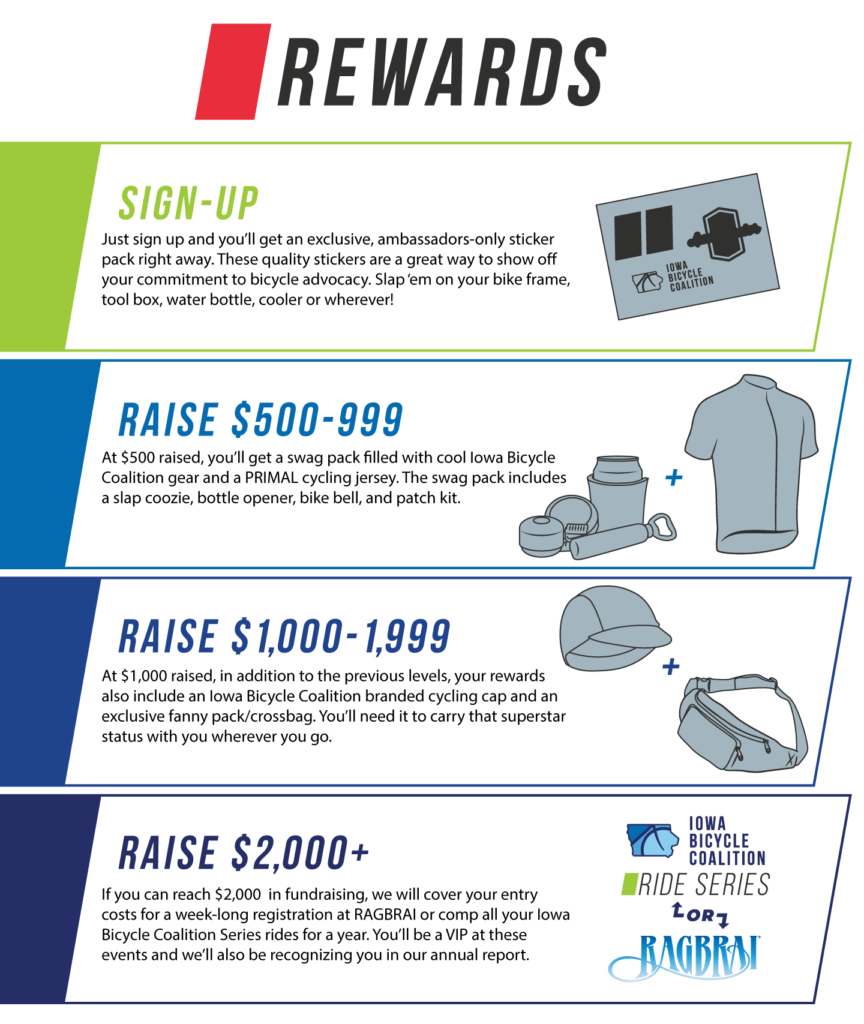 Our fundraising ambassadors do a lot for bicycle advocacy, and we want to give back a token of appreciation to the ambassadors who are helping to lift up the voice of bicyclists in Iowa. Just for signing up to be a fundraising ambassador, we’ll send you an exclusive ambassadors-only sticker pack with some cool bicycling designs to show off. Then we have prize goals at $500, $1,000, and $2,000 with more exclusive stuff. When your campaign reaches those goals, we’ll send you some cool stuff!